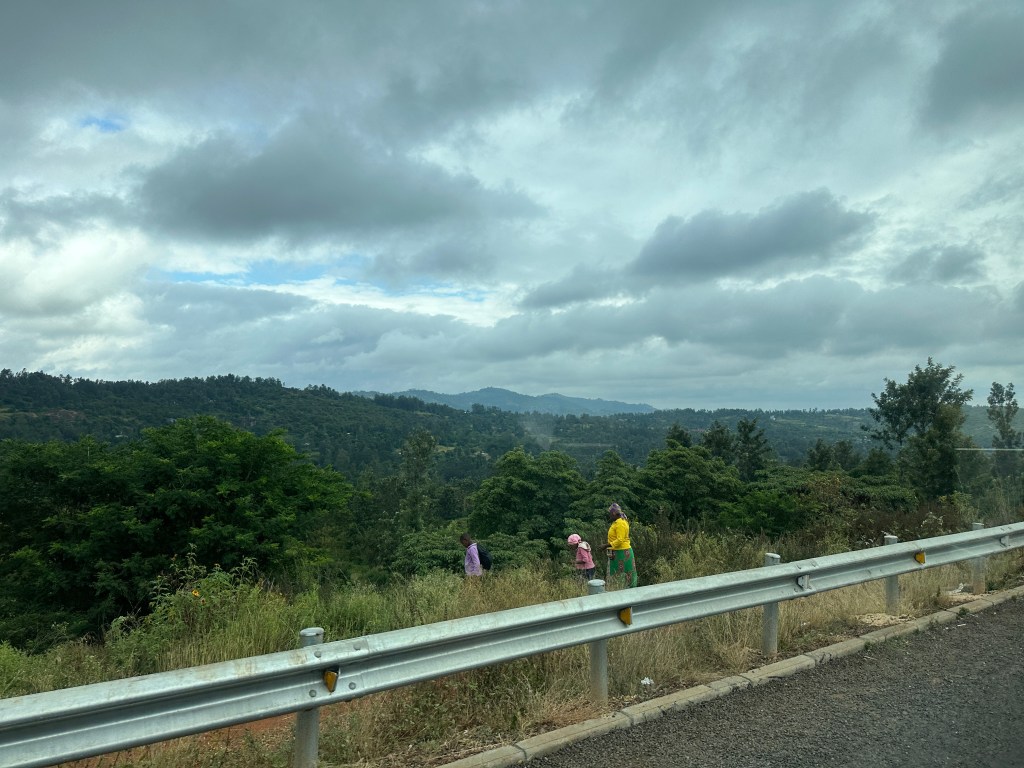 Eventually the landscape changes, you pass through an agricultural area where they grow pineapple, bananas, mangoes, guava, papaya, you name it. Every couple of kilometers there are speed bumps so people can cross the highway and there are loads of people selling fruit and other things. As you continue to gain elevation and distance from the city, there is coffee, sugar cane, and you start to see cows, goats, and sheep, many grazing right by the road with individuals (sometimes very young children) watching over them. And finally it starts to thin out to large stretches of rolling grassland with mountains in the distance (but still, people everywhere you look, most walking somewhere!)
