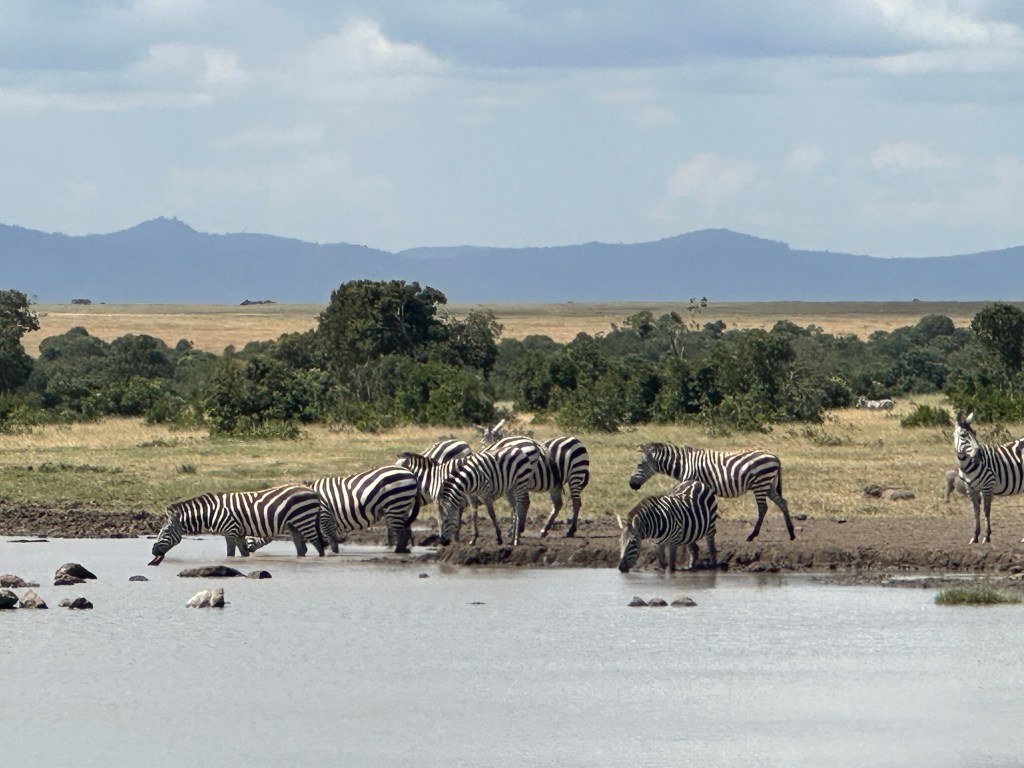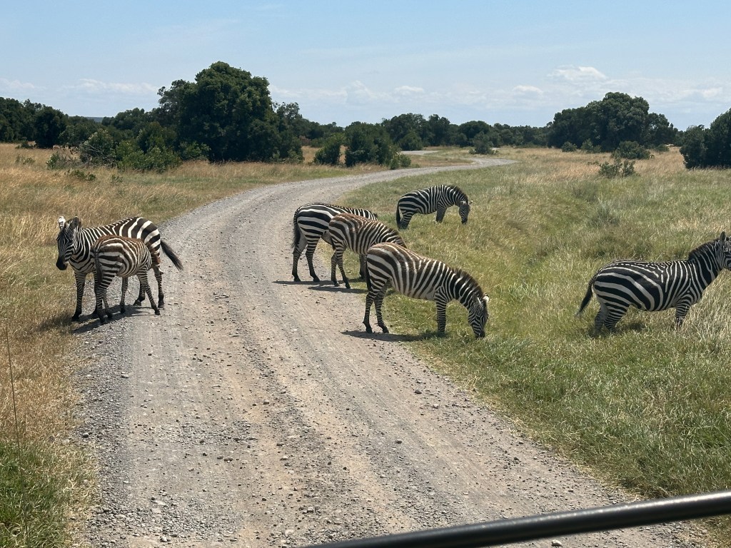 We arrived at the conservancy, which is known for its efforts to save the Northern White Rhino and chimpanzees, at noon. It was (and still is) hard to contain my enthusiasm and I can’t help but think about how students have reacted to past trips and know that they will just go out of their minds with excitement! After settling in to our rooms (high-end tents on the edge of the park overlooking a watering hole where the wildlife is very active), we went for our first game drive and immediately got up close and personal with everything you would expect, especially the Reticulated giraffe. Other introductions included: Grant’s Gazelle, Thompson’s Gazelle, Impala, Pumba (kudos to Disney for using the actual Swahili words to name some of their characters!), Eland, White and Black Rhinos, grey crested cranes, African Buffalo, Guinea fowl and tons of other birds that I can’t capture on film and am getting better at identifying, then two female lions who will make an appearance later in the story. We drive out in specially outfitted Land cruisers where the top pops up so you can stand and look. The equator runs right through the park, so we made the obligatory stop at the hemisphere boundary as well.