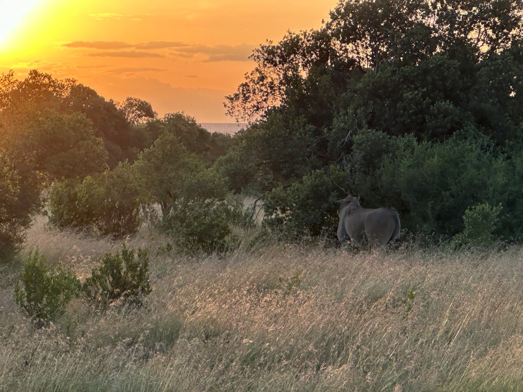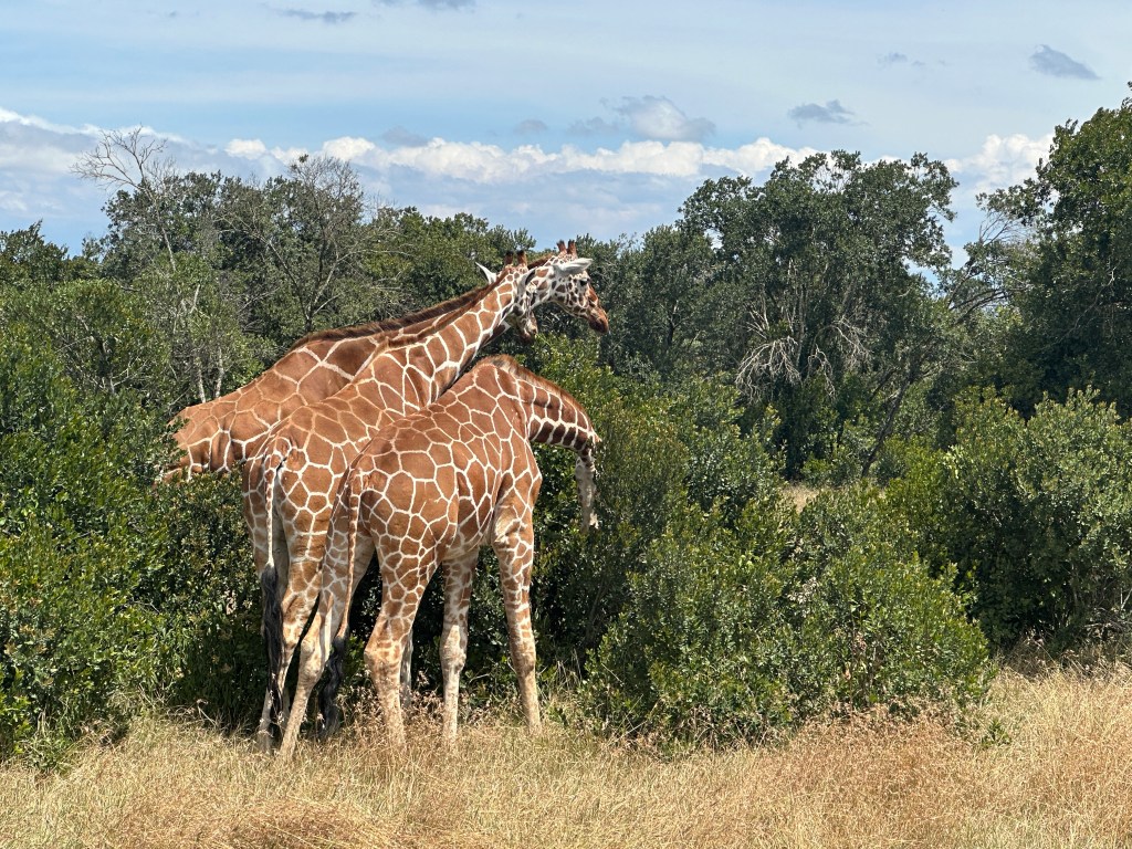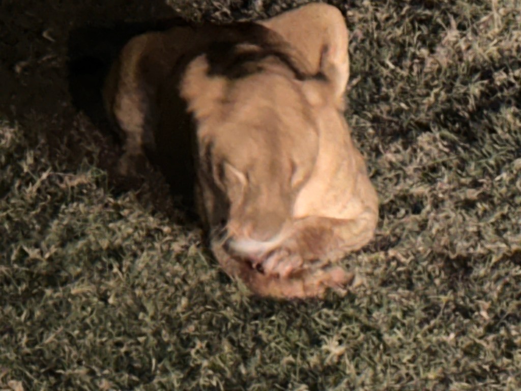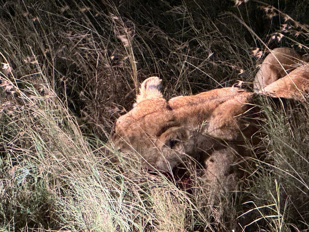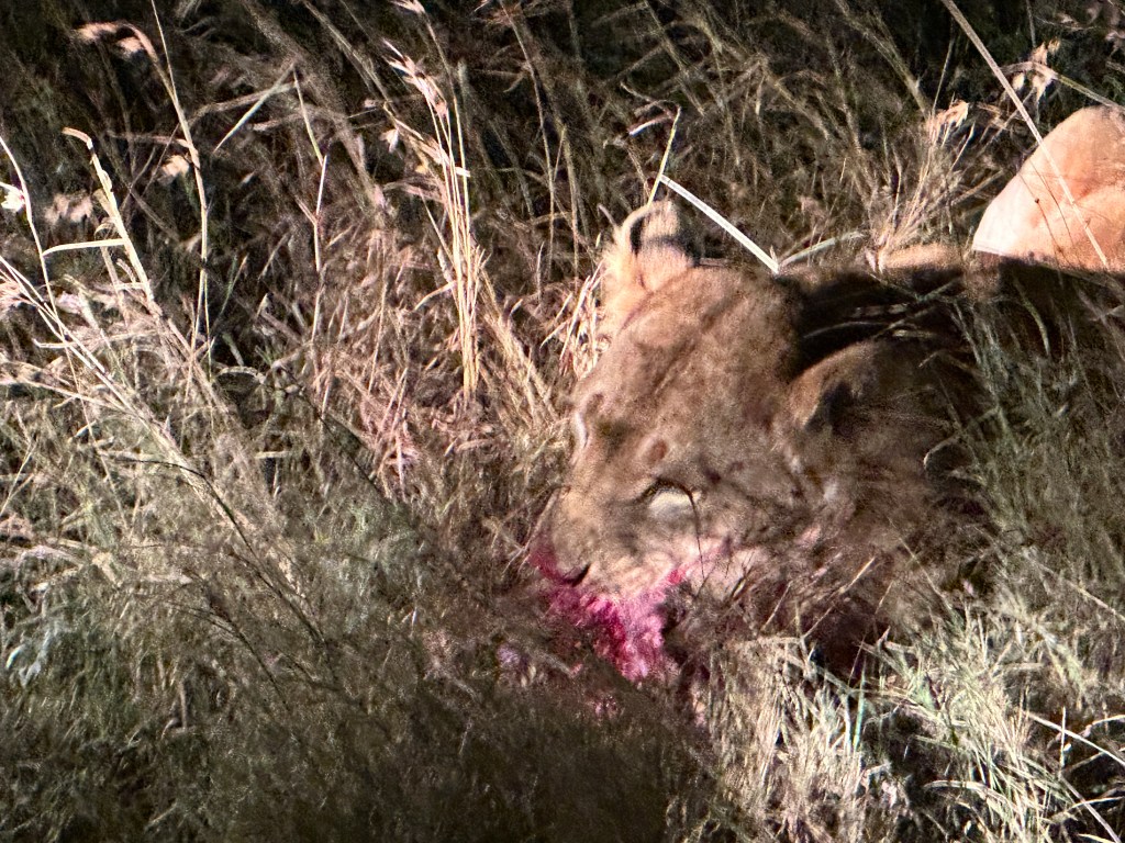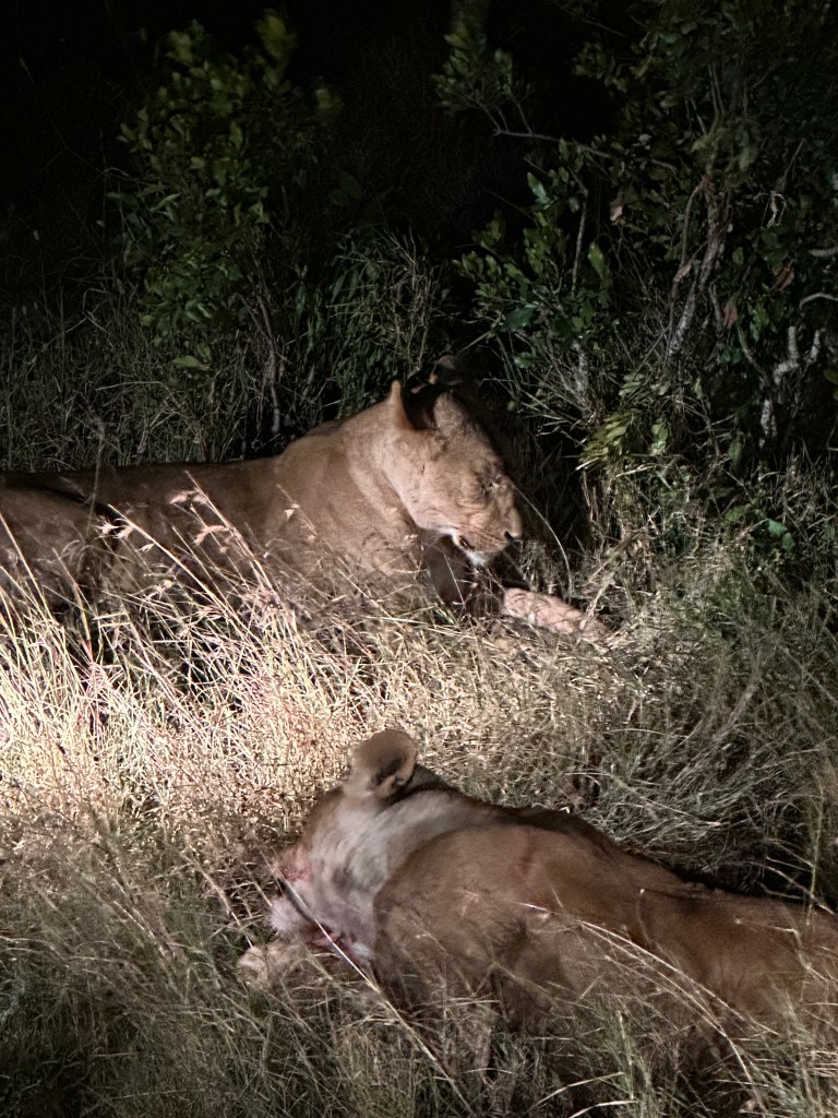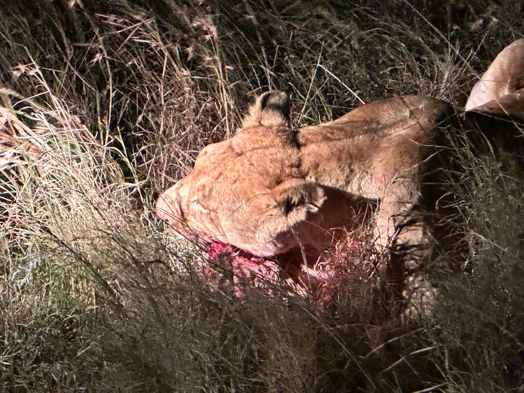 One of the unique things of this refuge is it is privately owned so it is the only one in Kenya at which you can do a night safari. Myself and one other couple (same age, lifelong eagles season ticket holders!) were the only ones to opt for the 9-11 pm drive. The guide asked what we wanted to see and the woman right away shared that she was desperate to see a lion kill. This is something that is EXTREMELY hard to see, so we headed out hopeful but realistic. After tons of hares, a mongoose and lots of plovers, they said, “hang on” and drove off road to another jeep and sure enough, the two female lions we had seen way off in the distance lounging, were consuming a tiny gazelle. We arrived after the kill, and I should be clear that only one of them was actually eating. They were a mother and cub (though the cub was only slightly smaller than the mother. But mom would NOT let daughter anywhere near it and would let out a tow curling growl every time she came near. We were within ten feet of the whole thing. It was beyond description. I took so many videos that I am having a tough time finding the best one on an iPad, but the crunching of the bones was like a foley artist with an unlimited supply of celery, its hard to hear over the wind. She ate every bit of it, there was NOTHING left for us to determine which type of gazelle it was. We were there for a good 3o minutes and then watched as she exhibit all too familiar house cat behaviors cleaning herself up after.