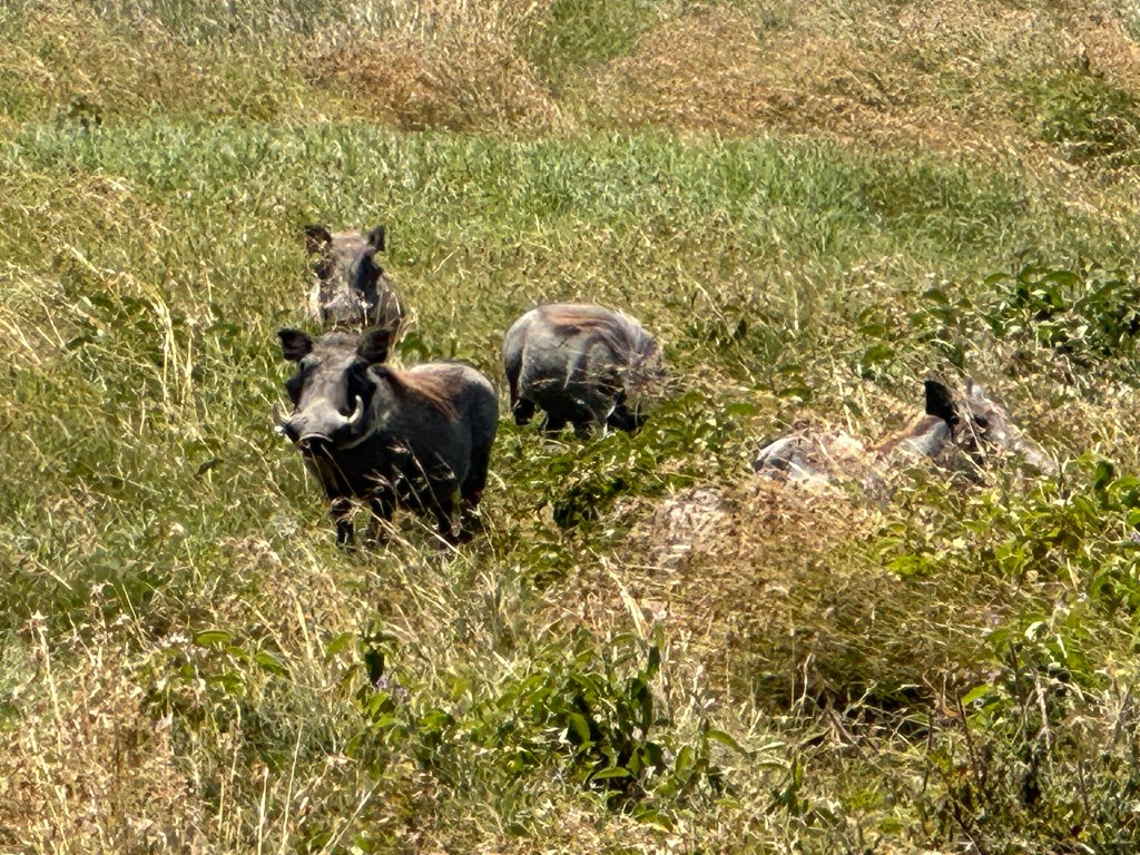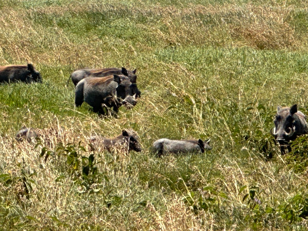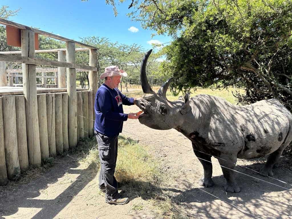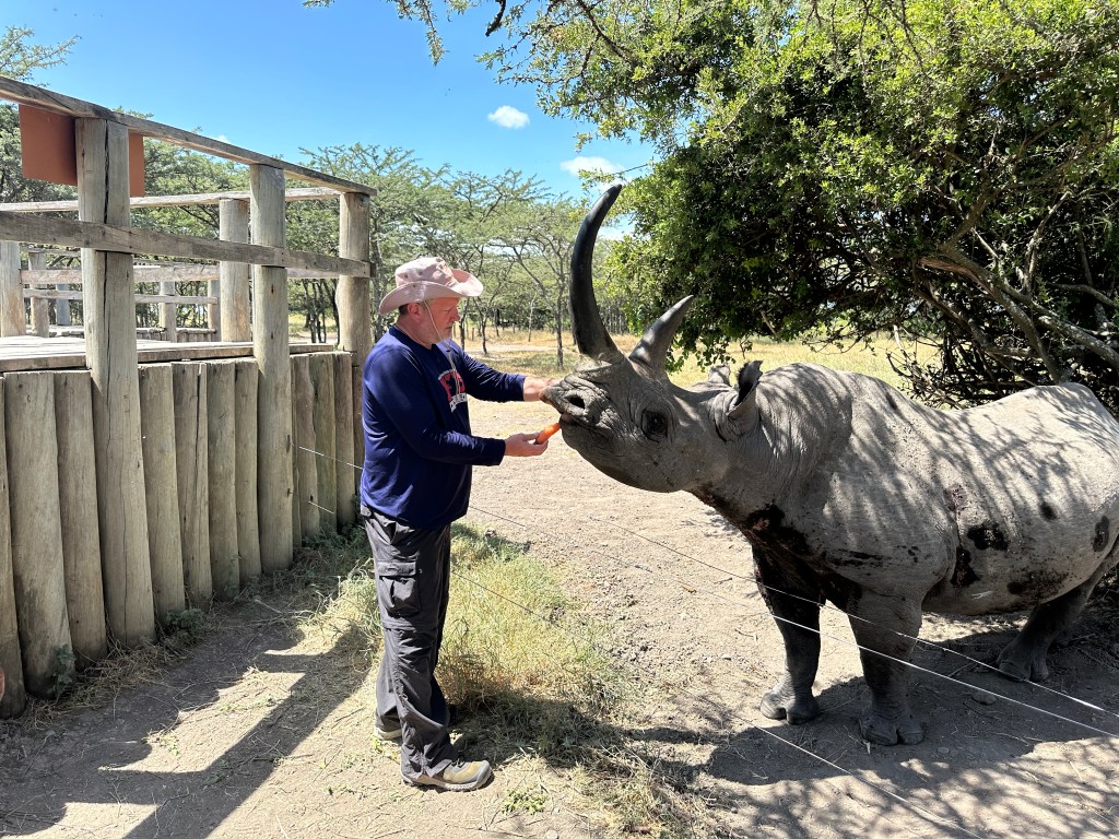Zacharia brought a large bucket of carrots with us and fed them and got them to come over to us for shameless photo opportunities, and to see them up close. It was my next emotional moment of the trip to touch one of the last two living animals and hope beyond hope that they are successful in saving them. Similar efforts with other rhino species have been able to establish stable populations. A family of Pumbas seemed very hopeful that there would be leftovers from the feeding. You can also see Fatu in the background (she is Najin’s daughter) who was more interested in sleeping than eating on this occasion. The Rhino with the black spots is one of the female southern whites who is a candidate for surrogacy. By the way, the name white Rhino has nothing to do with color and is just a language misunderstanding from the description of this type of rhino having a wide mouth for eating grass as opposed to the black rhino that has a protruding mouth to be able to grab vegetation from bushes to eat.