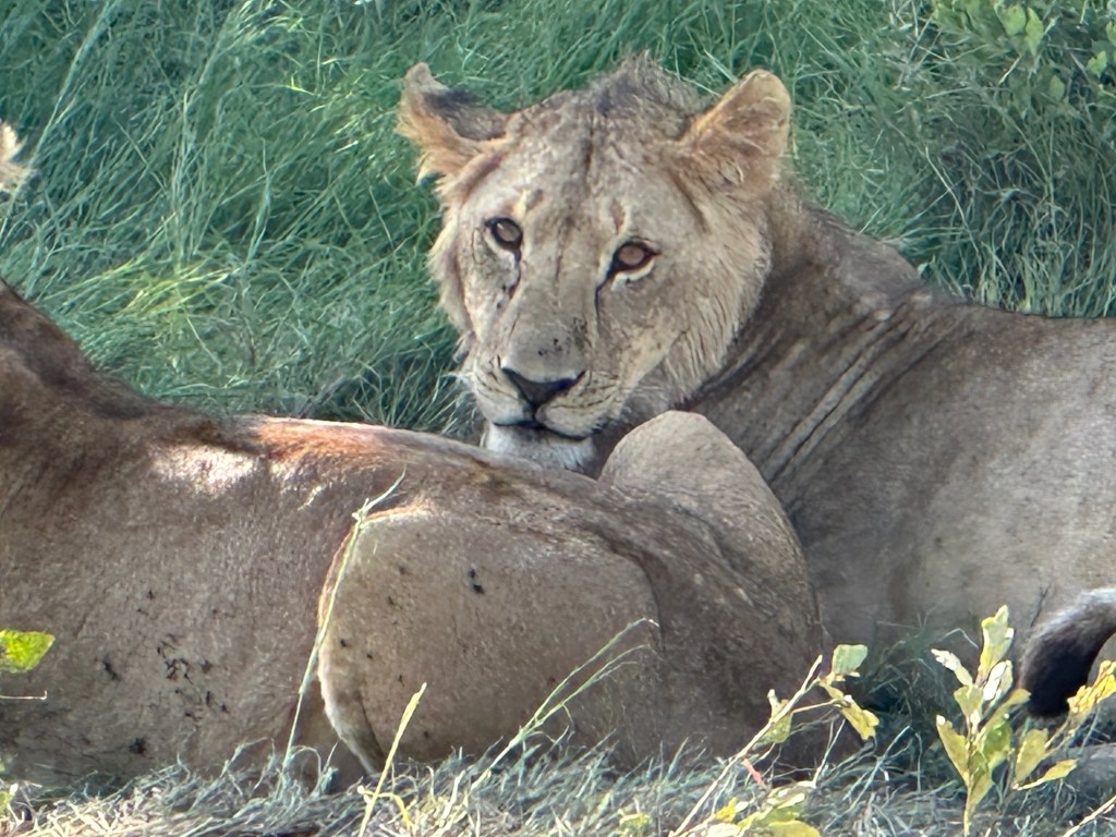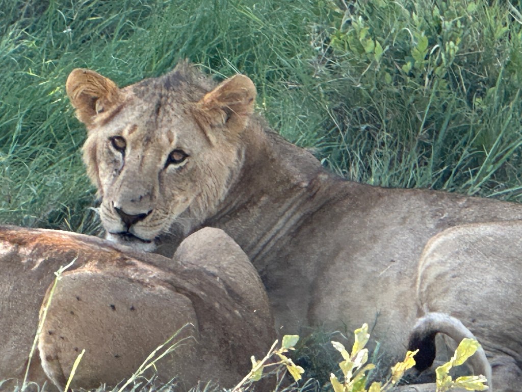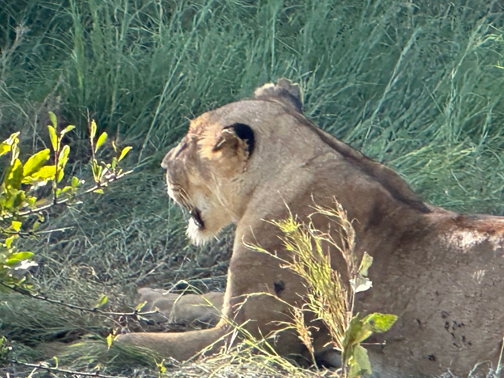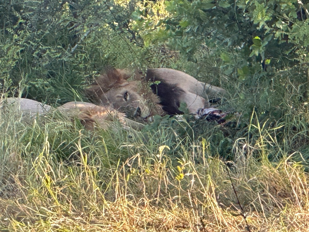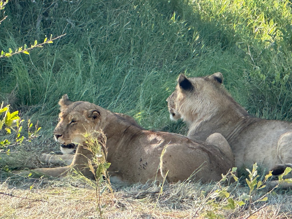 This was followed closely by our guide spotting two beautiful lions, one female and one young male, hunkered down in the bushes.