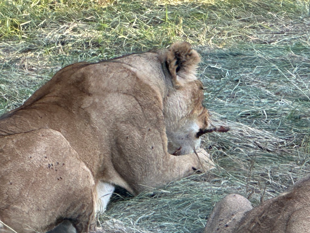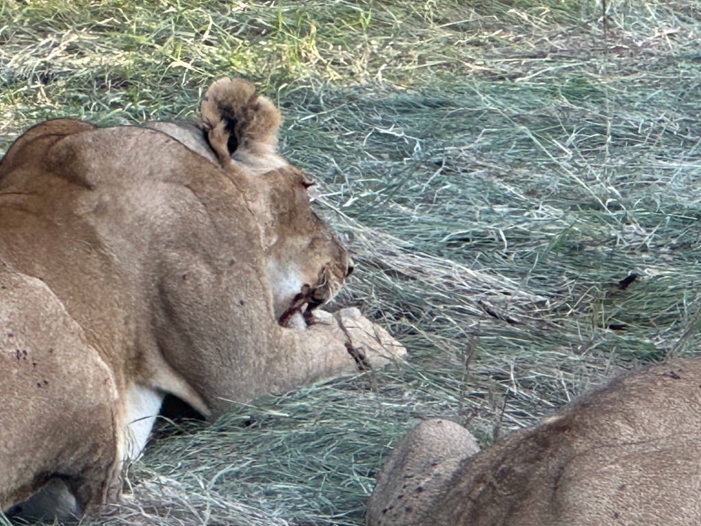 This is a pride of six. Two adult males, two females, and a juvenile male. Later, our other driver, Timothy, told me that there is a cub in this pride as well. I wish we could have seen it but it must have been hiding back in the taller grass. After the males had gorged themselves on the prime parts and fallen into a food coma, the two females, who did all the work, were “allowed” to eat some of the leftovers!