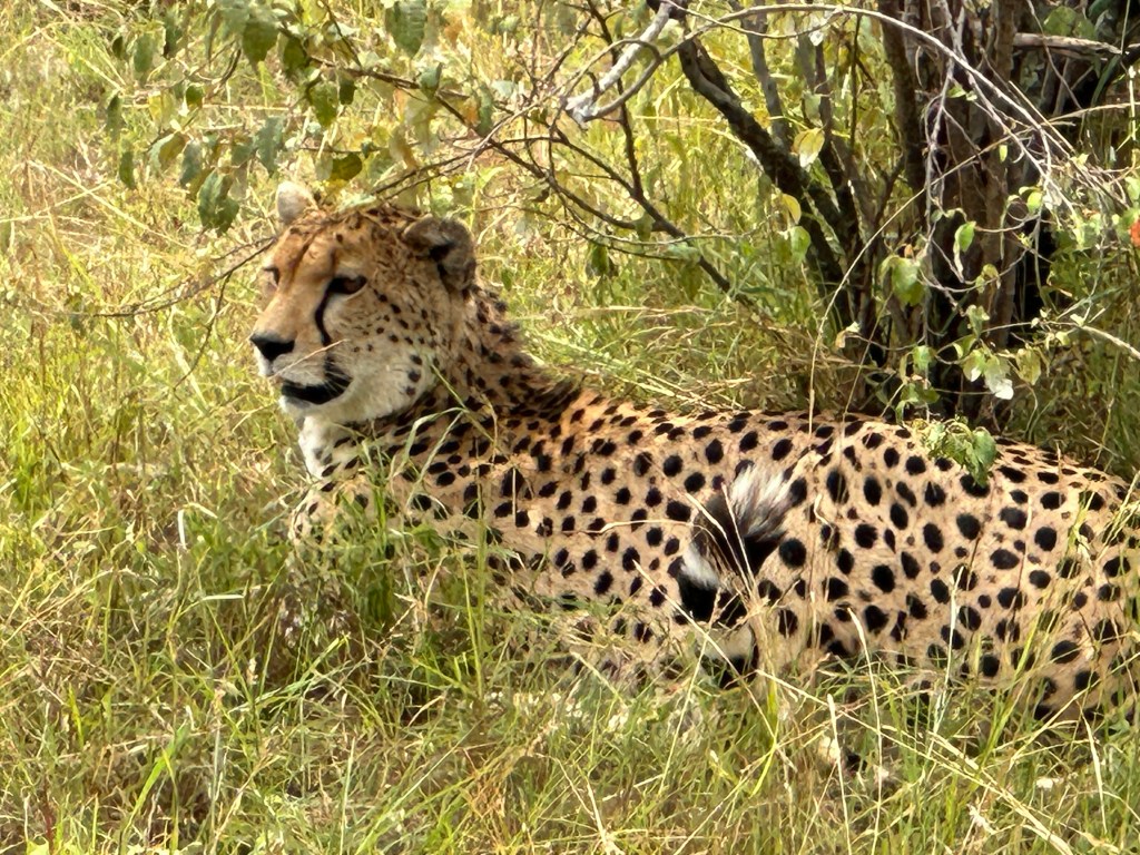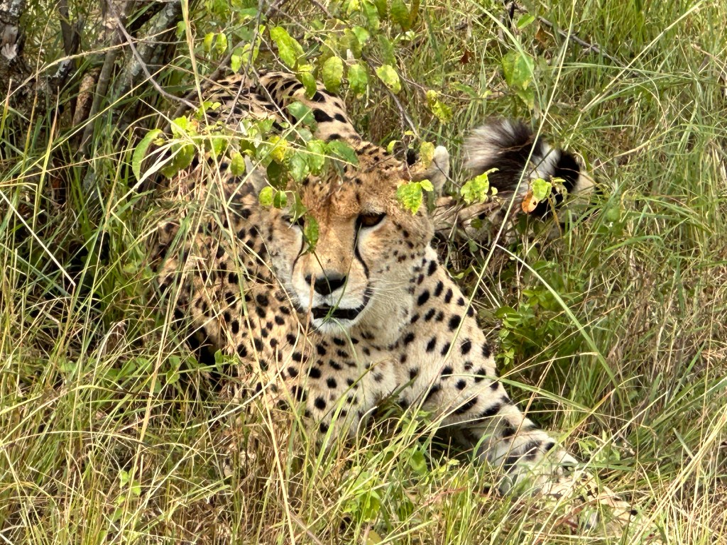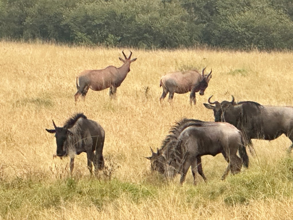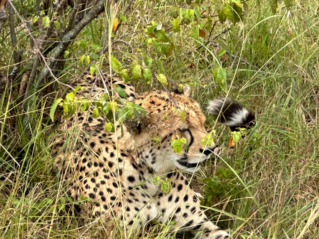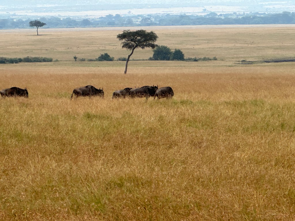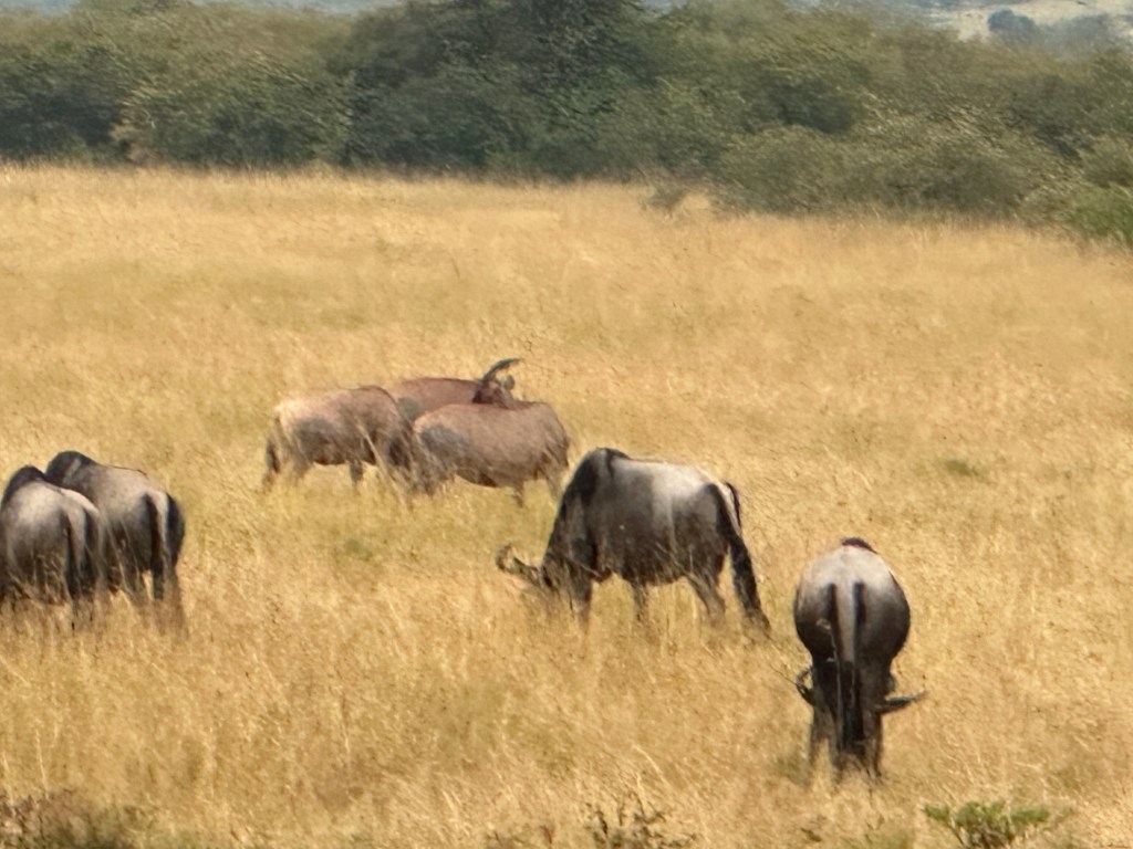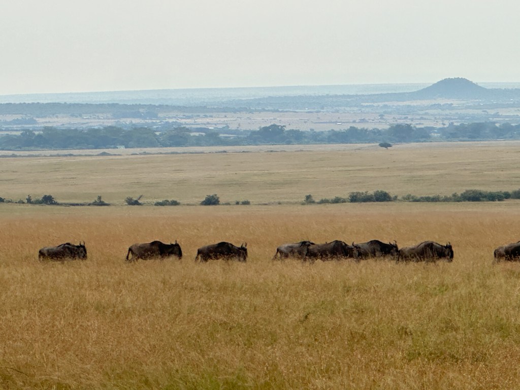 We said goodbye to our Maasai friends and headed for the Maasai Mara National Park. We are close to the busy season so there were a lot of trucks entering the park this morning. A vast grassland that reminds me of the western plains only with abundant wildlife, it is actually part of the Serengeti and home to the famous annual migration in July that everyone has seen on the nature shows where the endless herds of wildebeest and zebra cross the river while crocodiles wait for them. The herds live in the Serengeti until the dry season. Apparently there is about a week of rain showers around this time that signals the grazing animals to begin the trek. Judging from the previous night’s rain, I missed it by about a week. This park was so much bigger than Ol Pajeta, it is hard to describe the 360 degree view, even harder to image that in a few days that same space will be covered in millions of wildebeest, and completely unfathomable that they will have devoured virtually every blade of grass in a few months. We saw some resident small herds of zebra and wildebeest who maintain a symbiotic relationship and one small group that were on the move, but missed the “big show”.