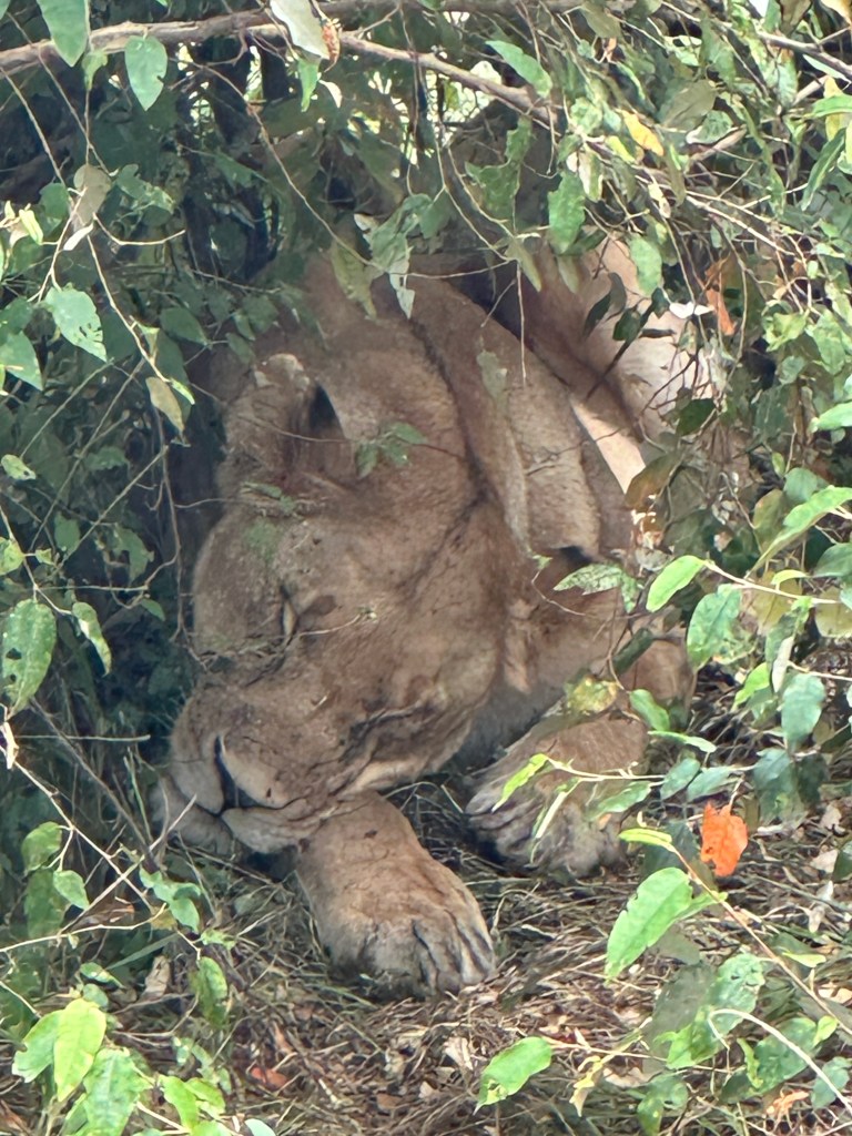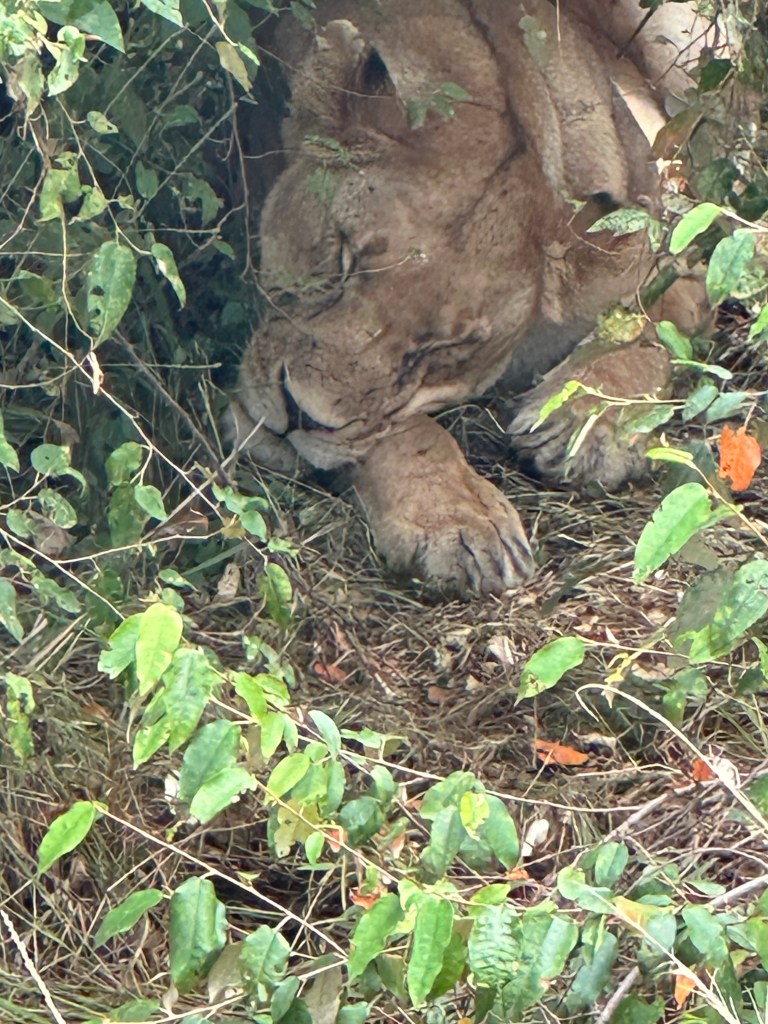 There were lots of trucks there to watch them and our driver, Jackson, knew the park rangers who were there to monitor things and they told Jackson that we could come back later when most people have left and they would let us drive in behind them for a spectacular view of them lounging in the bushes later on. I got especially great close views of one of the babies and mama.