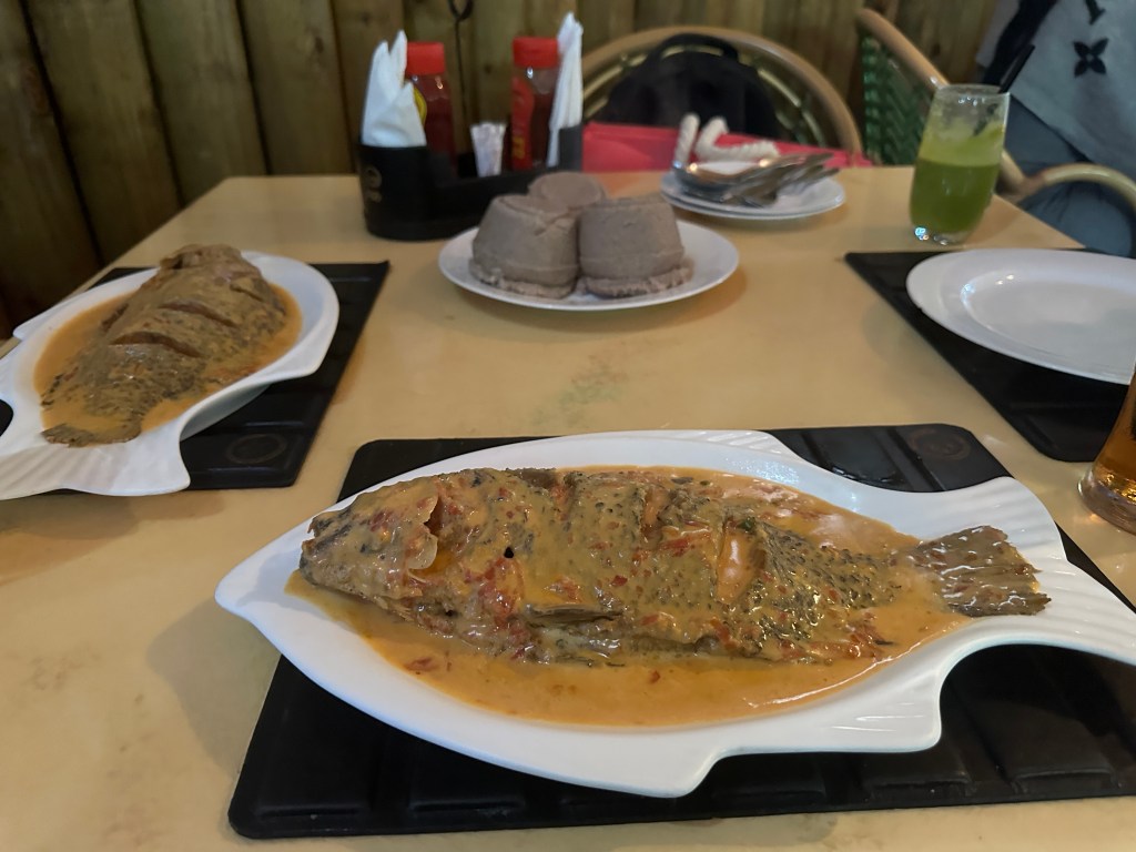After the trip to Crescent Island, we gathered our luggage and started the now familiar drive back into the vibrant bustle of Nairobi. Paul took me for an outstanding lunch at a nice restaurant for Kenyan food because I had been asking him about the traditional who fish. So we had a whole, incredibly fresh tilapia in coconut sauce with traditional Kenyan accompaniments of brown Ugali and spinach that we ate in true Kenyan fashion, with our hands. It was wonderful and we were both very full.